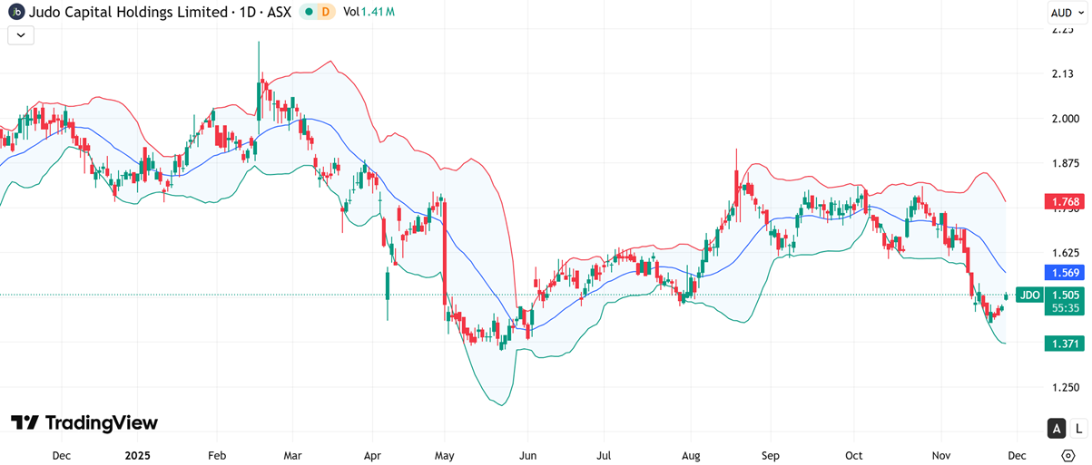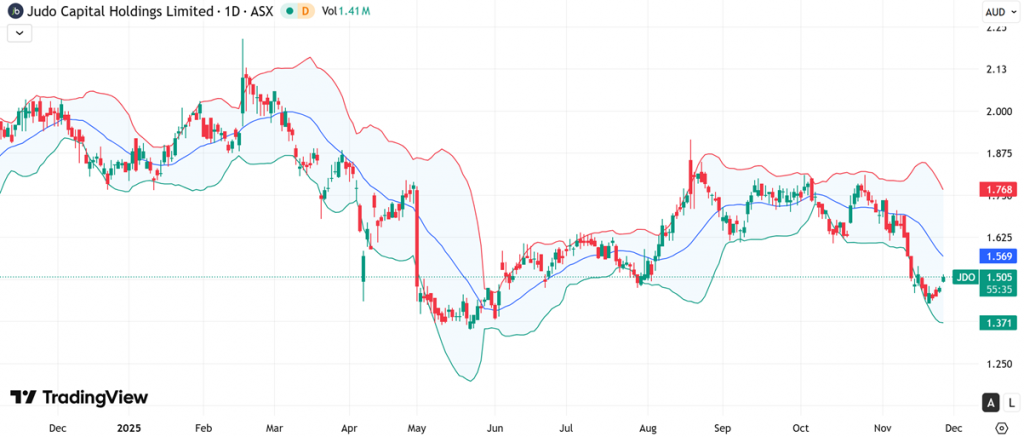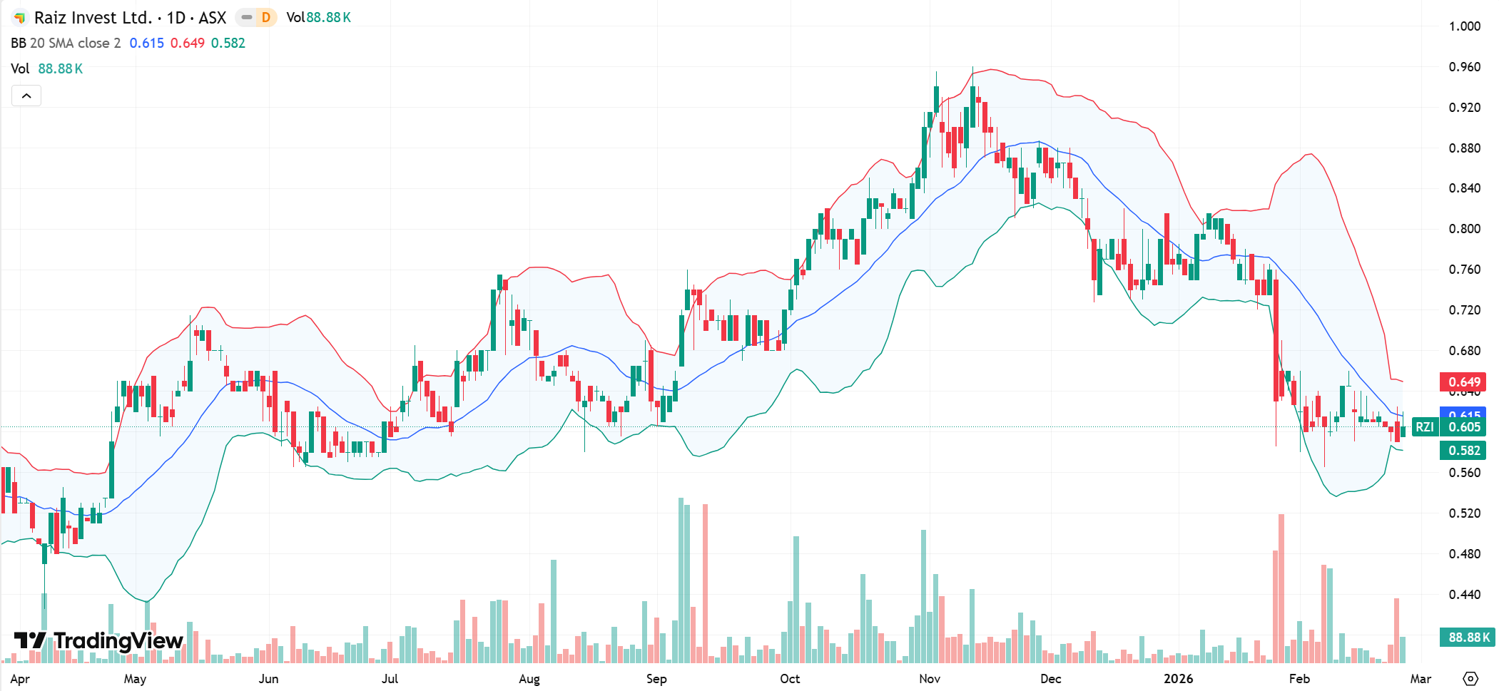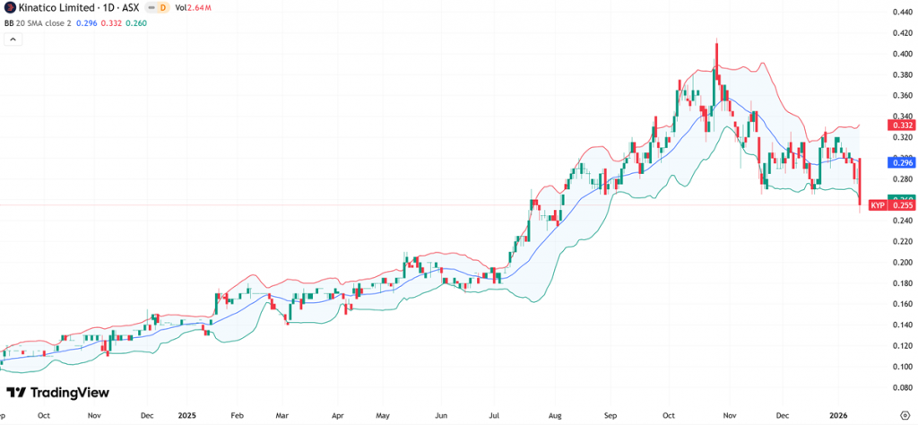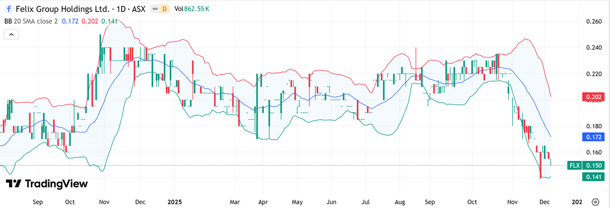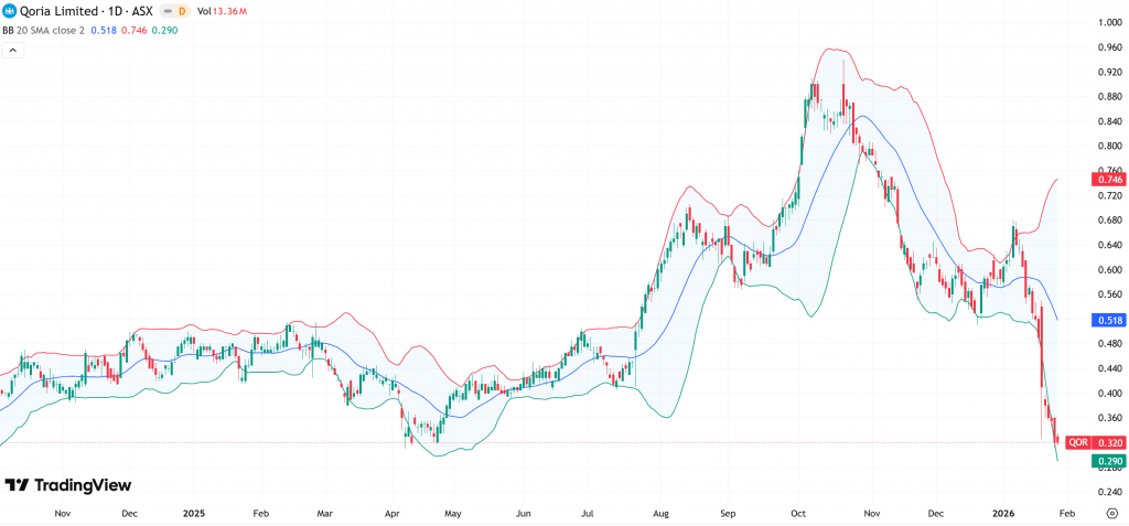 AMI is currently trading near the lower Bollinger Band around $0.215, with the 20-day SMA (mid-band) near $0.277 and the upper band around $0.338. The recent sharp move toward the lower band reflects heightened selling pressure, while the band expansion indicates elevated volatility. Notably, price is beginning to stabilise near the lower range, suggesting downside momentum may be moderating. Historically, such positioning often precedes consolidation phases, particularly as price gravitates back toward the mid-band, signalling potential for a gradual rebalancing in trend direction.