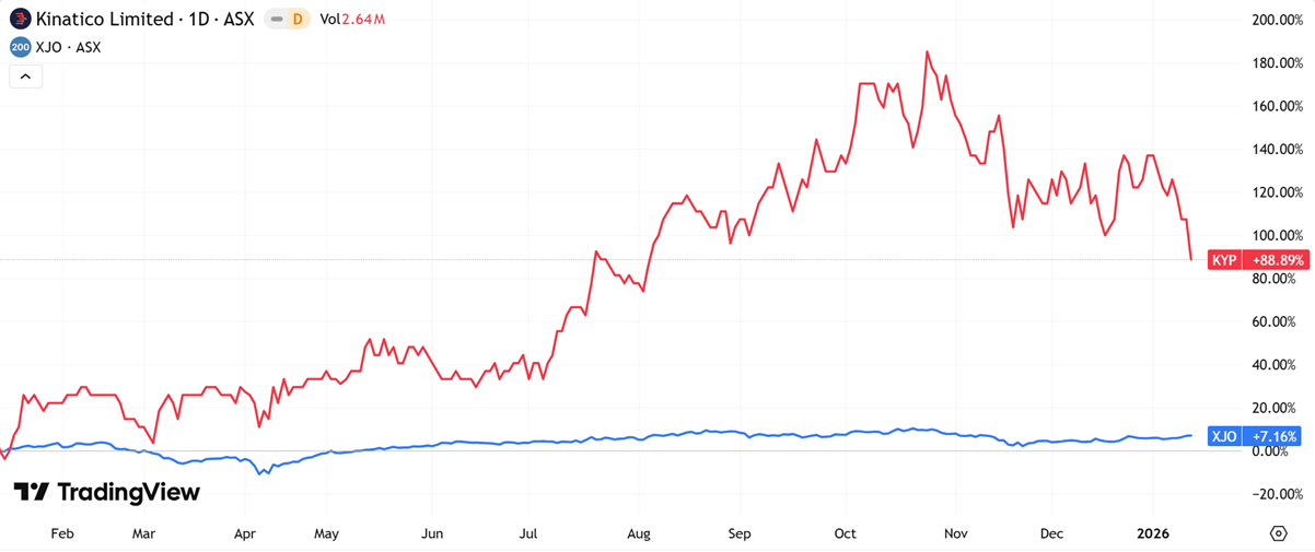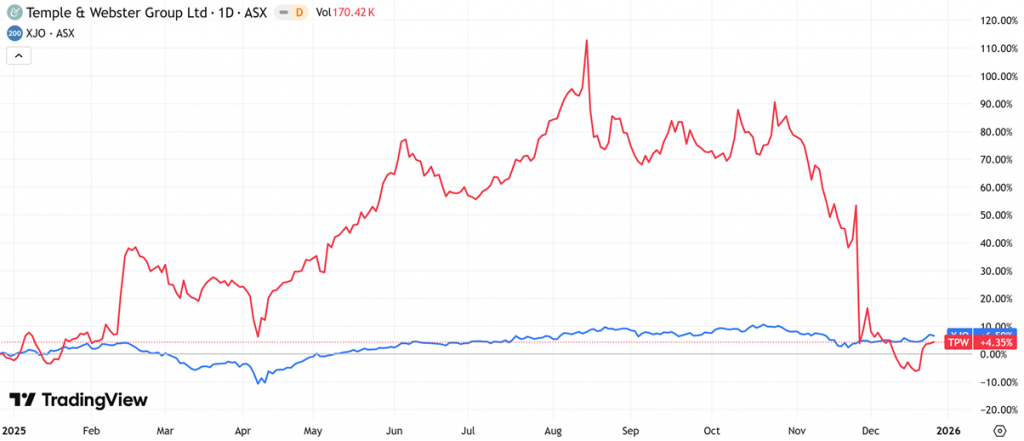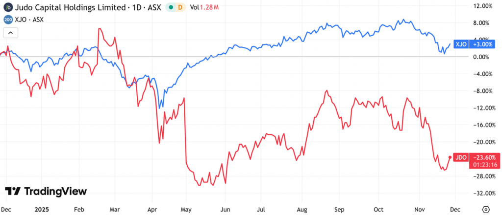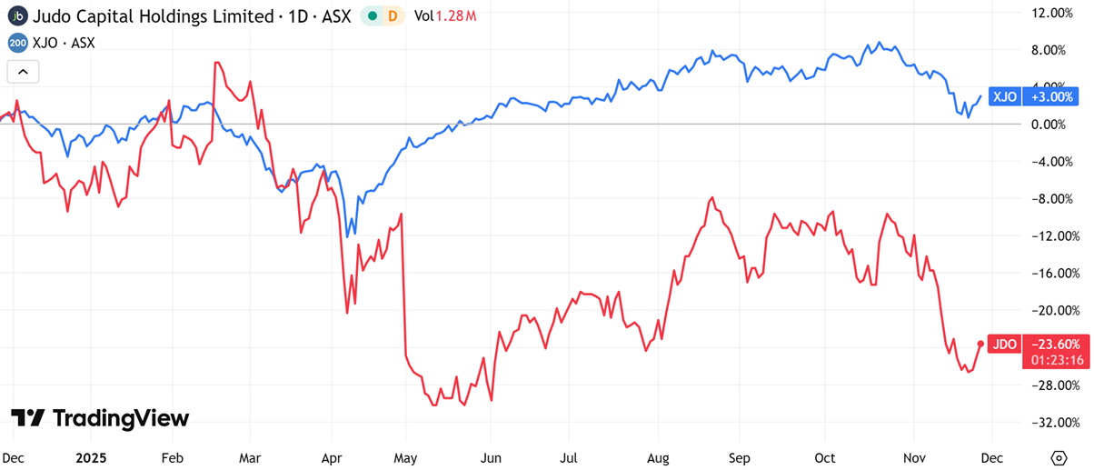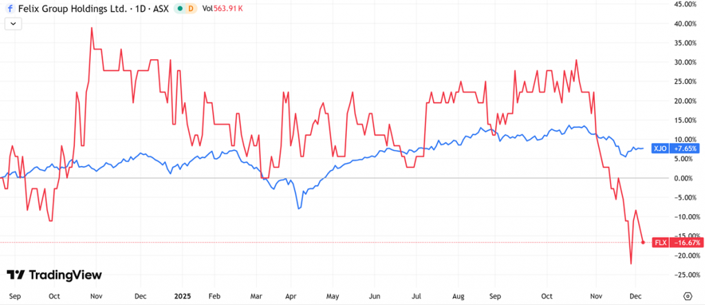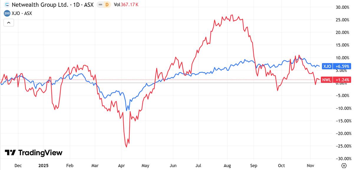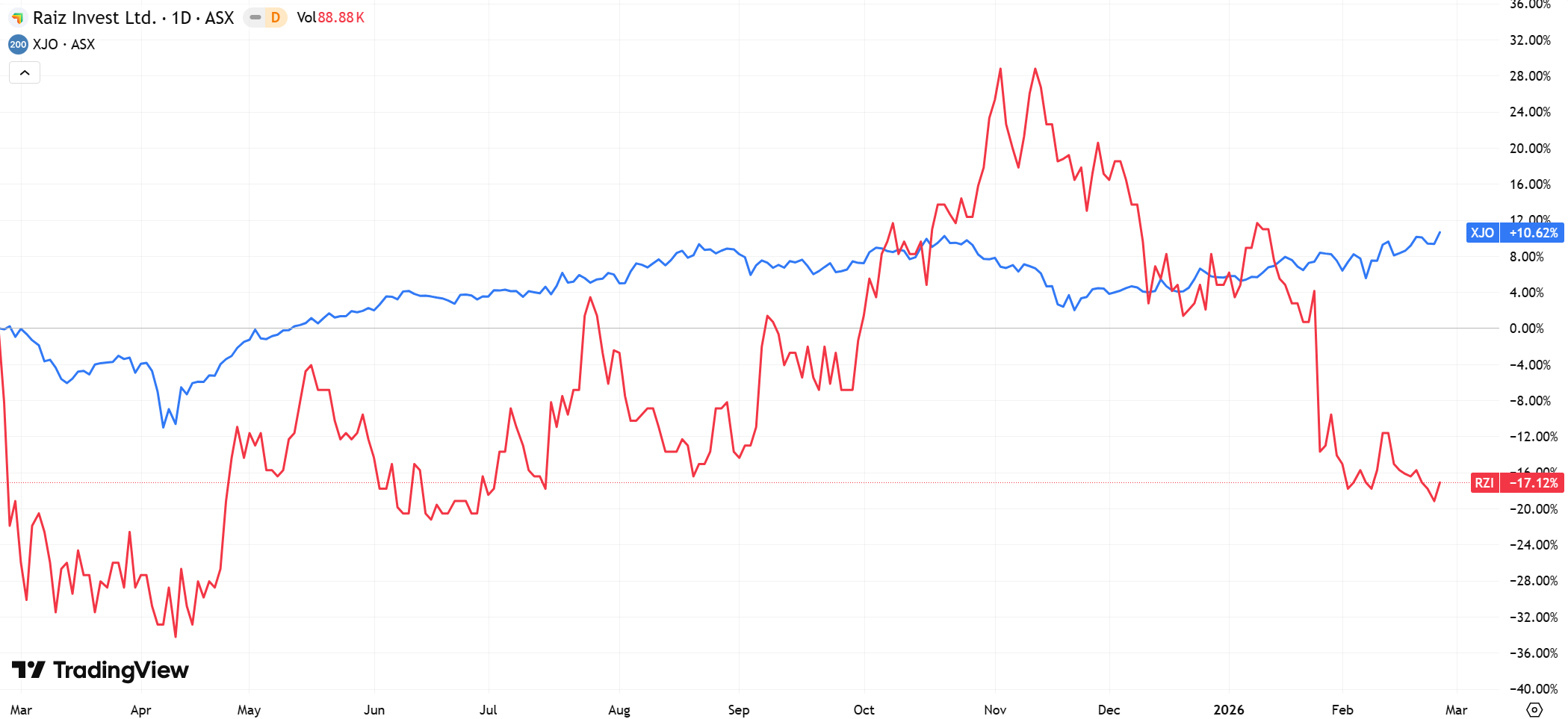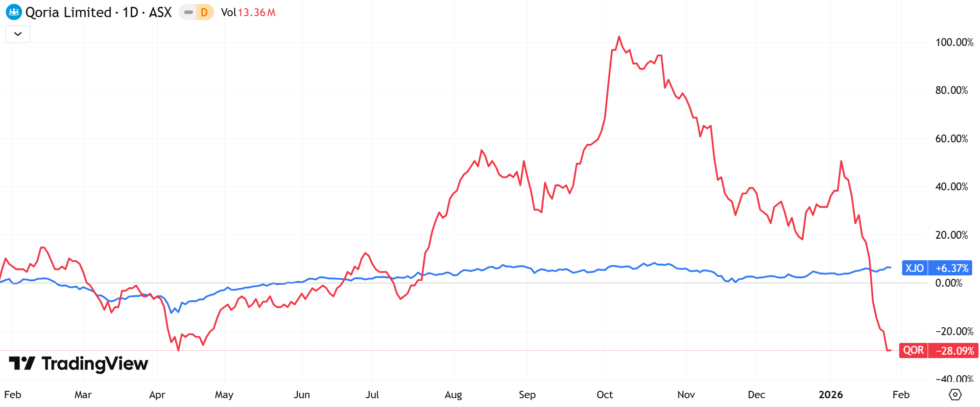 (Source: TradingView) One-Year Performance Profile of AMI on a DTF compared to ASX200 (XJO).