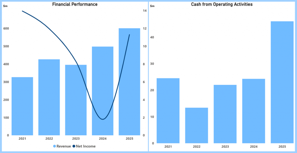 - Aurelia Metals’ revenue declined from $438.8 million (2022) to $309.9 million (2024) before recovering to $343.5 million (2025), reflecting operational resets. Earnings followed a similar path, shifting from losses in 2022–2024 to a $48.9 million profit in 2025, indicating improved execution.