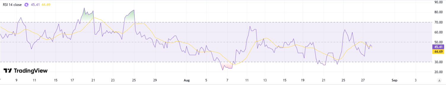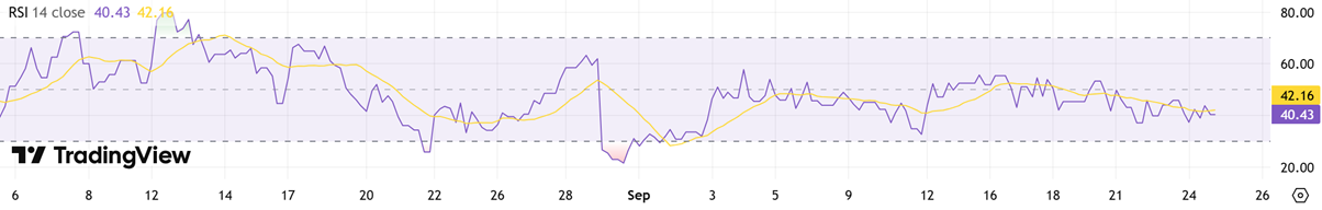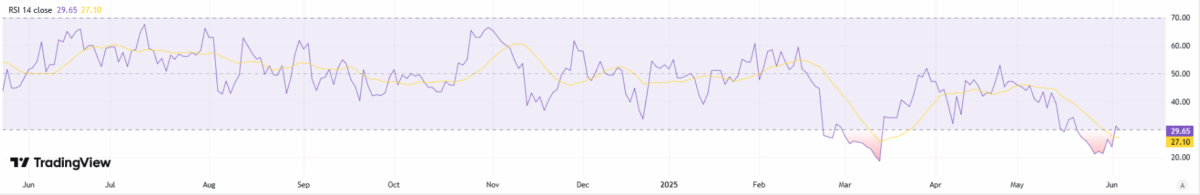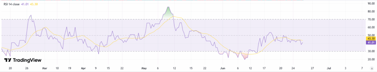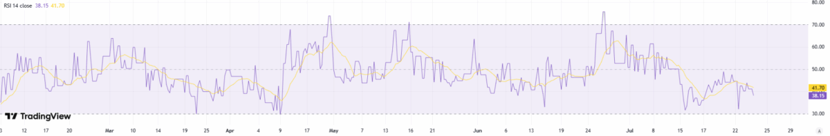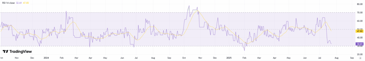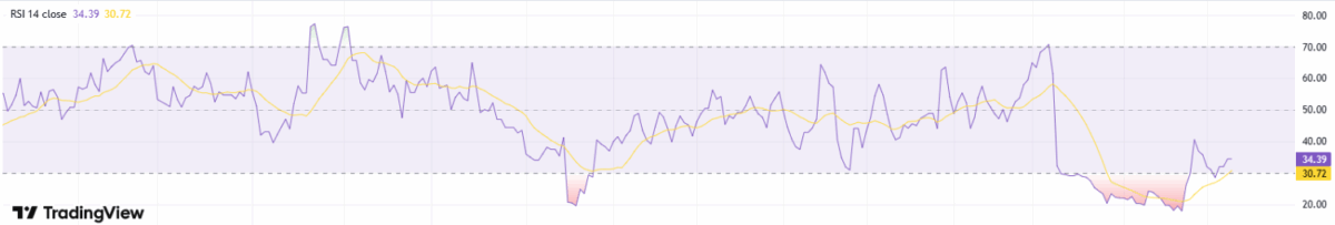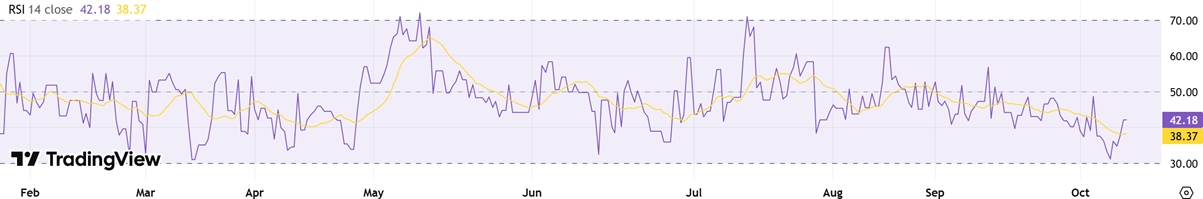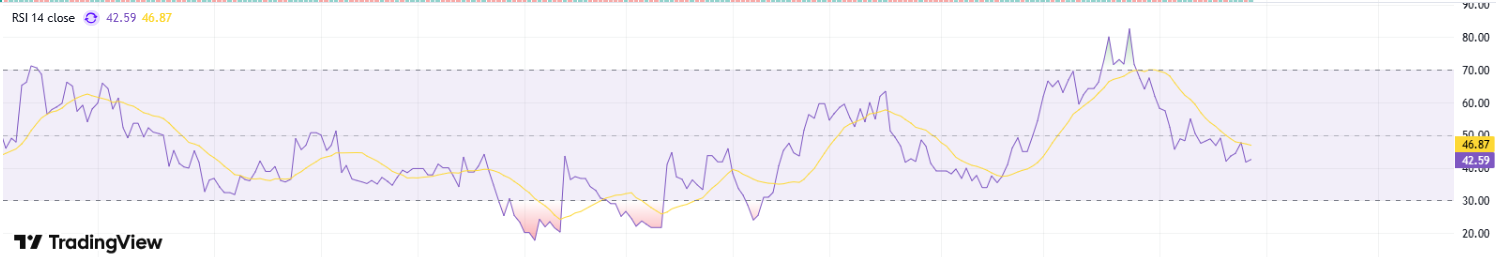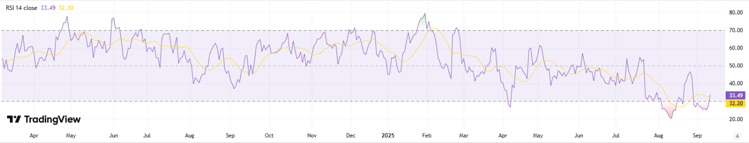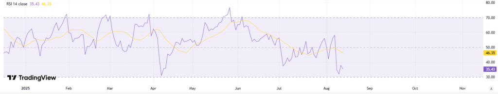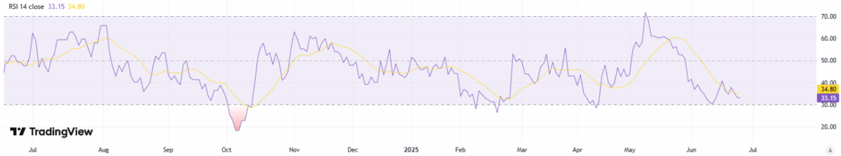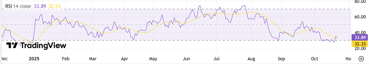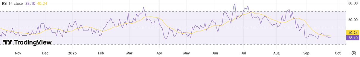 On the daily chart, RSI recovering into the high‑30s to low‑40s signals easing downside pressure and a return of measured buying interest. This upturn after oversold readings often precedes basing; holding above 40 would strengthen the case for consolidation before a push toward 45–50. A breakout in RSI through 50 alongside tight price ranges would add confirmation of a short‑term reversal, improving risk‑reward for incremental longs while keeping risk controls beneath recent swing lows.