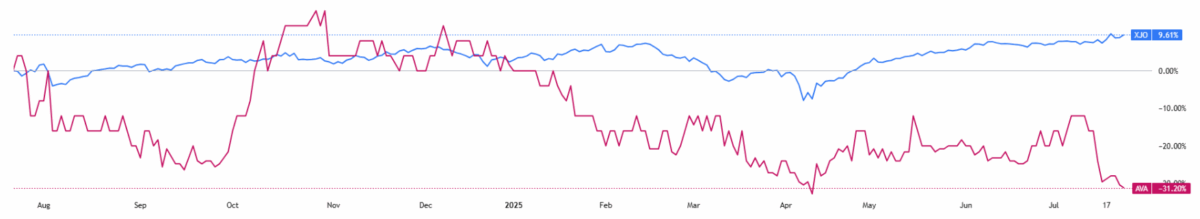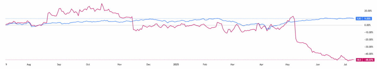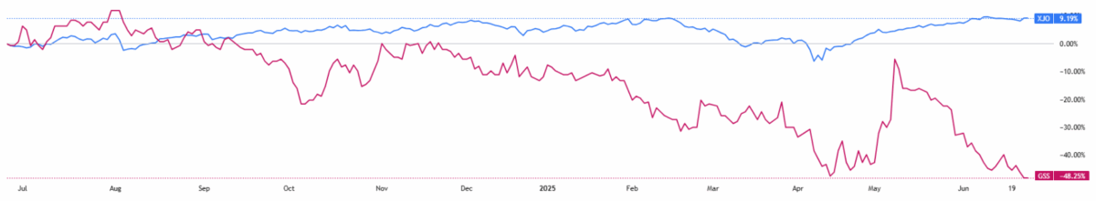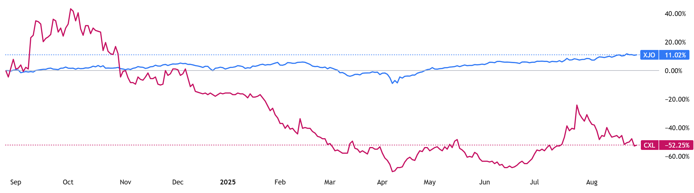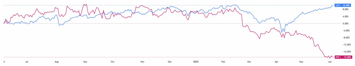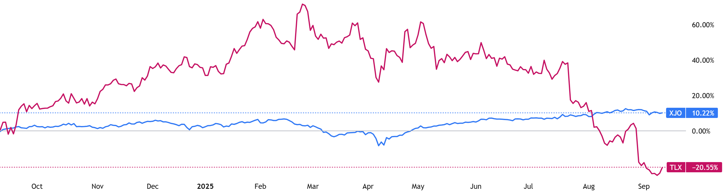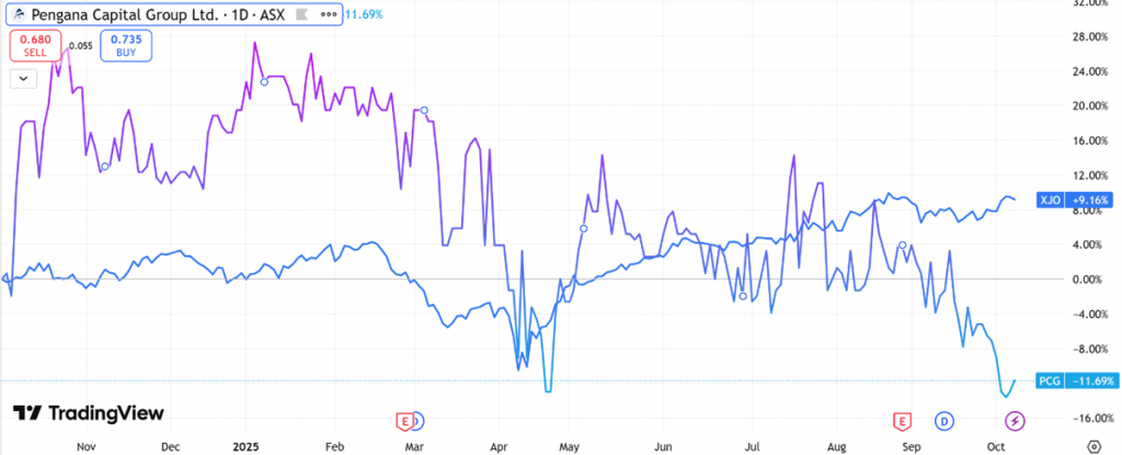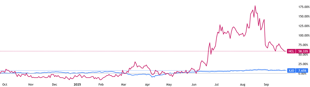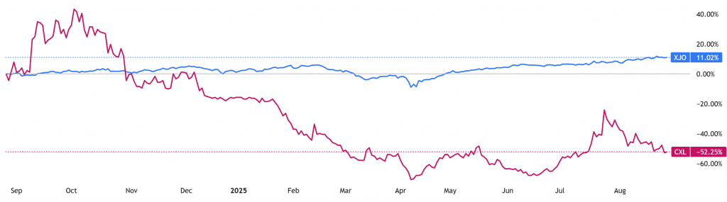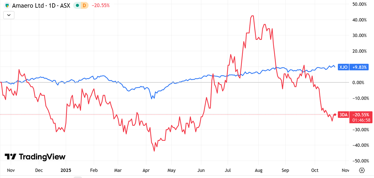 (Source: TradingView) One-Year Performance Profile of 3DA on a DTF compared to ASX200 (XJO).