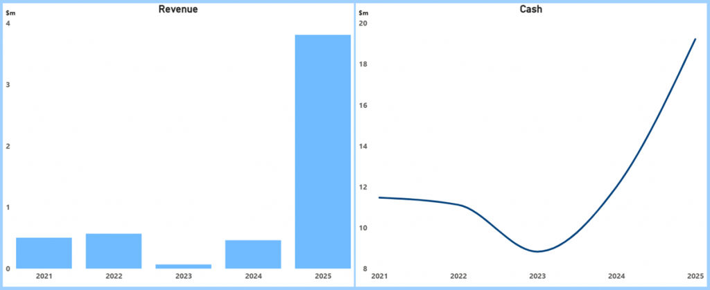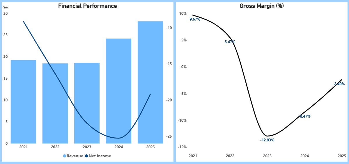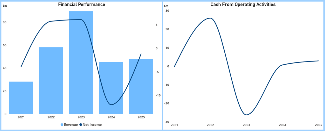 - Cash trended from about $11.5 million (FY2021) down to $8.8 million (FY2023) before rebuilding to $12.0 million (FY2024) and $19.2 million (FY2025), providing runway for execution and working capital as commercial volumes ramp. Management attributes the stronger FY2025 cash position to capital initiatives and operating momentum, alongside a five‑year exclusive powder supply agreement with Velo3D that underpins forward demand visibility.