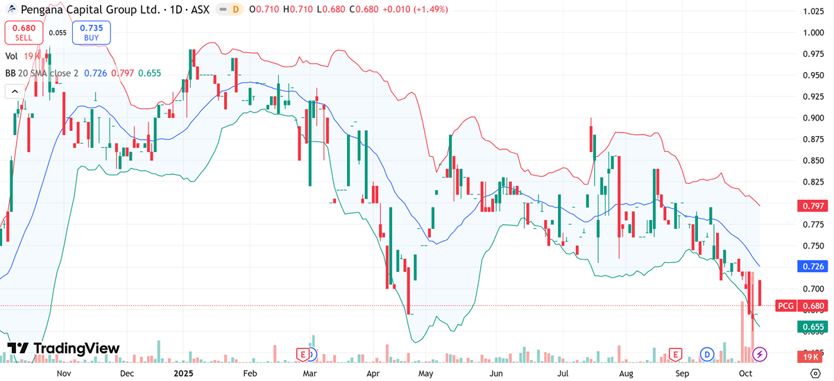 3DA is trading near the lower band around $0.25–$0.29, showing price is stretched on the downside and sellers are losing momentum as candles ride the band less aggressively. The mid‑band (20‑day average) near $0.32 is the first checkpoint; a close above it would signal mean reversion and increase odds of a push toward the upper band near $0.39. Band width has expanded after the recent drop and is starting to steady, which often precedes a pause or bounce if price can base above the lower band.