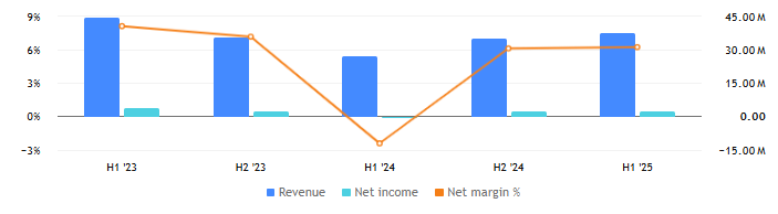Clover, despite experiencing a notable financial downturn in recent years, now displays strong potential for a meaningful recovery in FY25. This is evidenced by substantial improvements during the first half of the fiscal year, with revenues up 37% year-over-year to $37.6 million and a turnaround to $2.37 million in earnings from prior losses. These developments suggest the company may return to the healthier financial levels seen in 2022 and 2023. Despite these encouraging fundamentals, market sentiment remains subdued, resulting in a highly attractive valuation. The stock is currently trading at a P/E ratio of just 17x—well below its historical range of 30x to 50x—indicating significant upside potential as sentiment improves and financial recovery gains momentum.